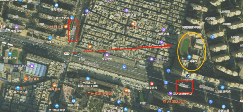雁西路(左)和雁北路(右)十字交叉,交汇点距兰州志成中学(黄圈)不足一个街区。