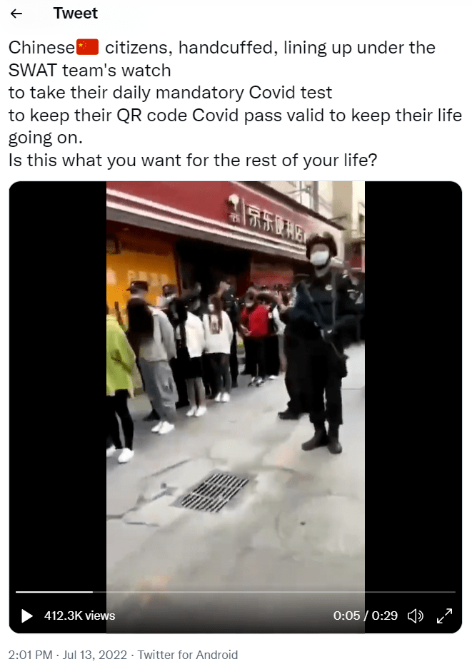 近日,推特上流传一段视频,声称显示中国公民在特警监视下,被手铐铐着排队做核酸。