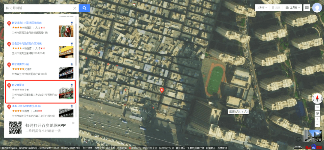 将百度地图定位在兰州市,搜索“陈记鲜面铺”,可以找到一家同名商铺,位于“兰州市城关区雁北路兰州志成中学西侧约50米”,其使用的店面照片显示的装潢和周边环境与视频中画面显示内容相差无几。