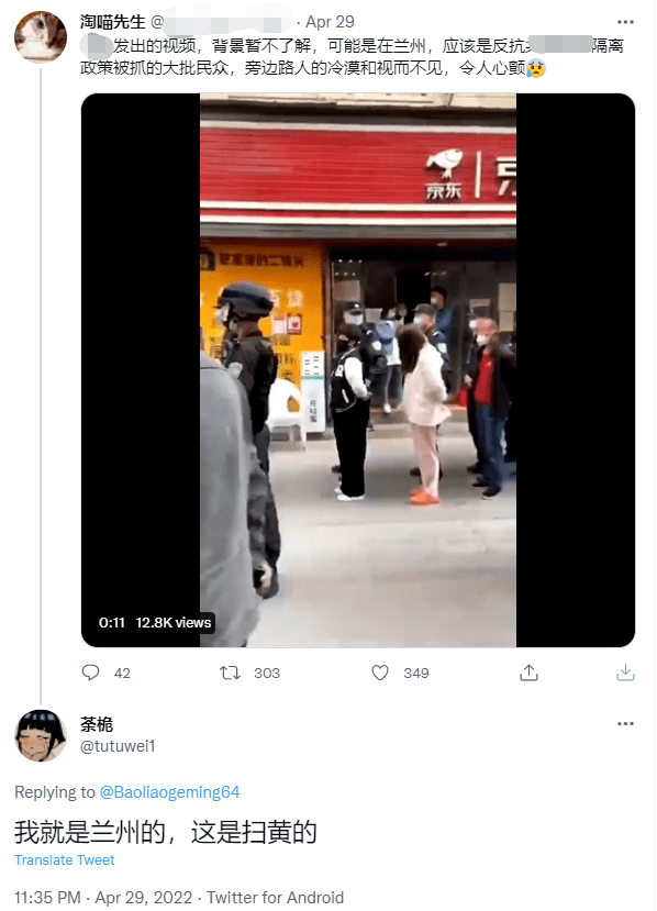 围绕“兰州 城关区 雁北路”等关键词展开搜索,发现上述视频早在今年4月已在推特上流传。推特用户“淘喵先生”在4月29日发布视频,称队伍中的人“应该是反抗隔离政策被抓的大批民众”,被网友@tutuwei1反驳道:“我就在兰州,这是扫黄的。”