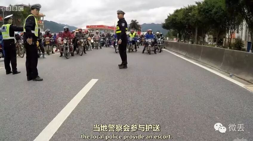 在摩托大军身边,有服务点提供免费的热粥姜汤取暖器,并有警车护送;