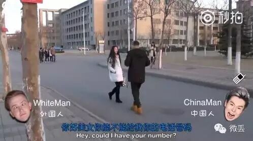 这次他们想做的测试非常简单粗暴,就是向校园中可爱的妹子要手机号码,谁多谁就赢。为了排除妹子英文没过四级不敢交流的情况,这位白人哥们发动了流利中文技能,现在比赛开始!